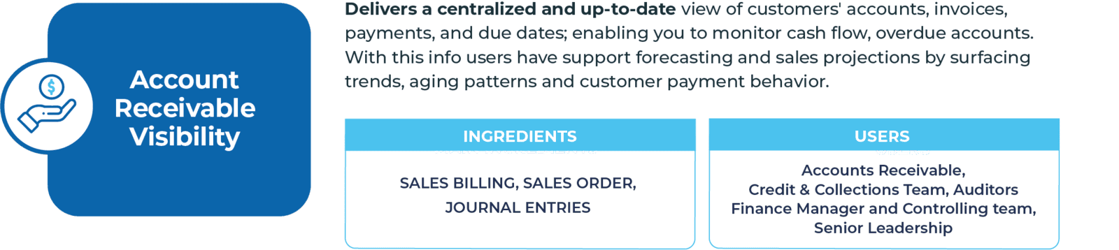 Delivers a centralized and up-to-date view of customers' accounts, invoices, payments, and due dates; enabling you to monitor cash flow, overdue accounts. With this info users have support forecasting and sales projections by surfacing trends, aging patterns and customer payment behavior.