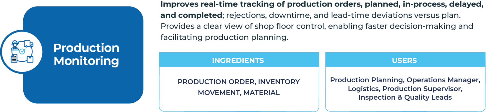 Improves real-time tracking of production orders, planned, in-process, delayed, and completed; rejections, downtime, and lead-time deviations versus plan. Provides a clear view of shop floor control, enabling faster decision-making and facilitating production planning.