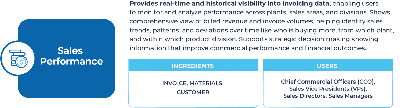 Provides real-time and historical visibility into invoicing data, enabling users to monitor and analyze performance across plants, sales areas, and divisions. Shows comprehensive view of billed revenue and invoice volumes, helping identify sales trends, patterns, and deviations over time like who is buying more, from which plant, and within which product division. Supports strategic decision making showing information that improve commercial performance and financial outcomes.
