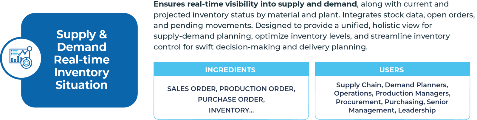 Ensures real-time visibility into supply and demand, along with current and projected inventory status by material and plant. Integrates stock data, open orders, and pending movements. Designed to provide a unified, holistic view for supply-demand planning, optimize inventory levels, and streamline inventory control for swift decision-making and delivery planning.